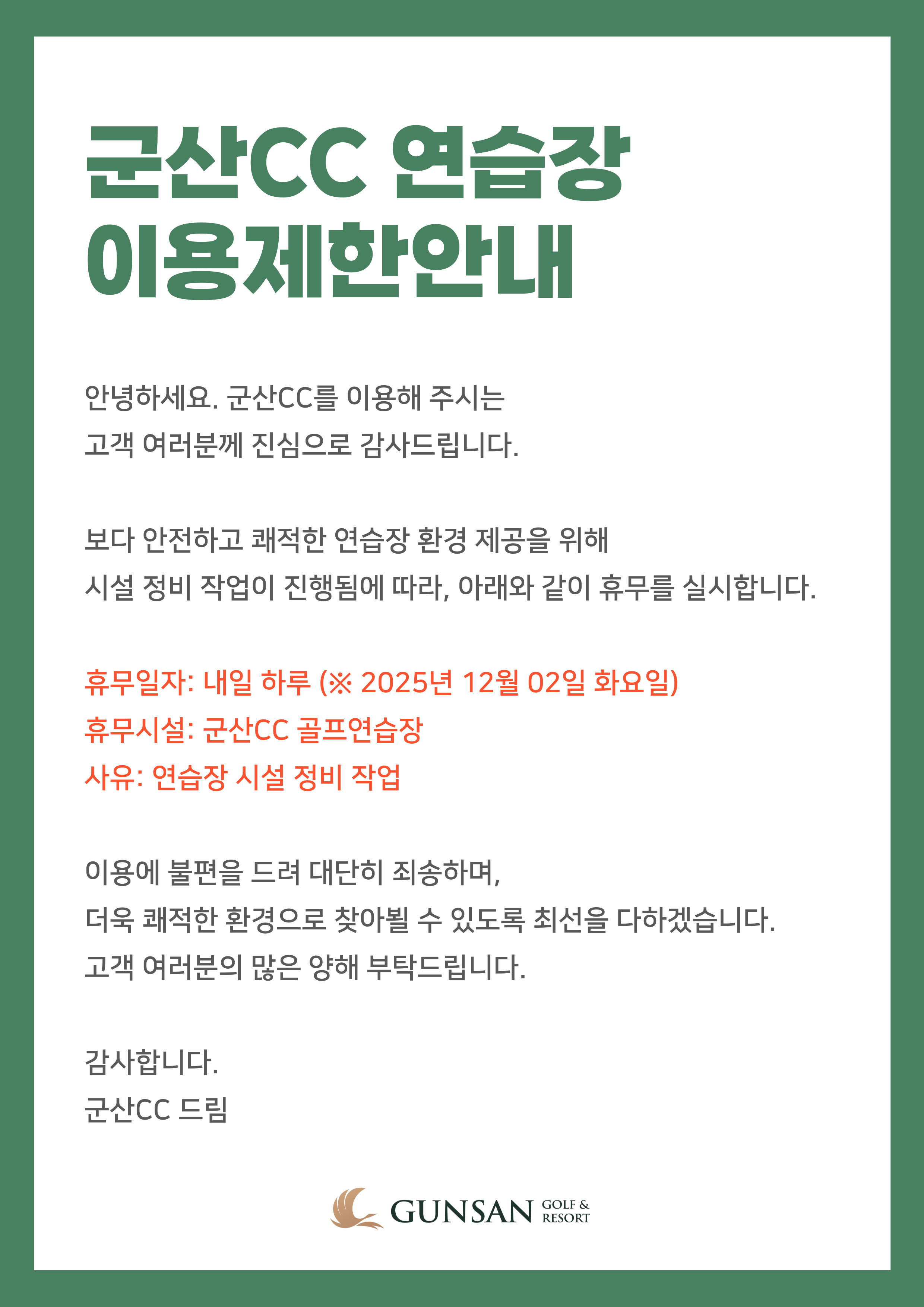 [공지사항] 군산CC 연습장 이용제한안내